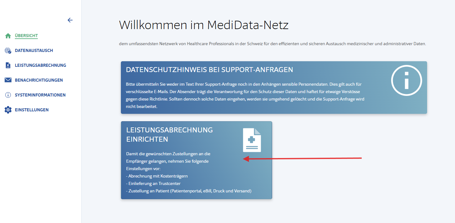 Nach der Anmeldung auf "Leistungsabrechnung einrichten" klicken: